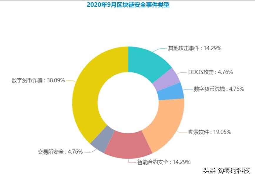 据零时科技区块链安全威胁情报平台统计,2020年9月,区块链生态共披露21起区块链安全事件:勒索软件攻击4起、智能合约安全事件3起、交易安全事件1起、数字货币洗钱事件1起欧易交易所,节点攻击事件1起,DDOS攻击事件1起,数字货币诈骗事件8起,其他攻击事件3起。