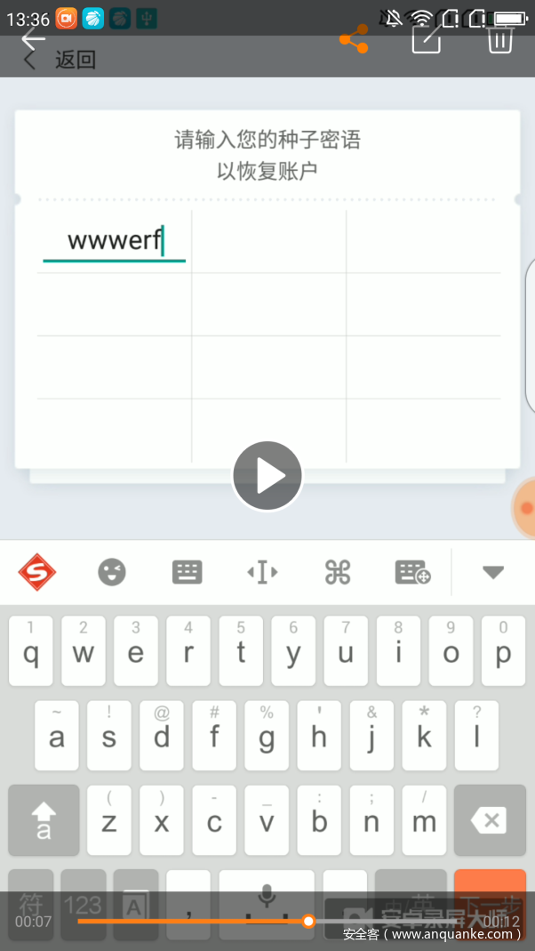 我们在非Root环境下对其进行了录屏测试,发现助记词生成阶段无法录屏,但导入钱包时可以录屏。 这可能会导致助记词泄露、数字货币账户被盗。 同时,我们发现输入交易密码时还存在录屏漏洞。 通过观察按键顺序可以得出交易密码。