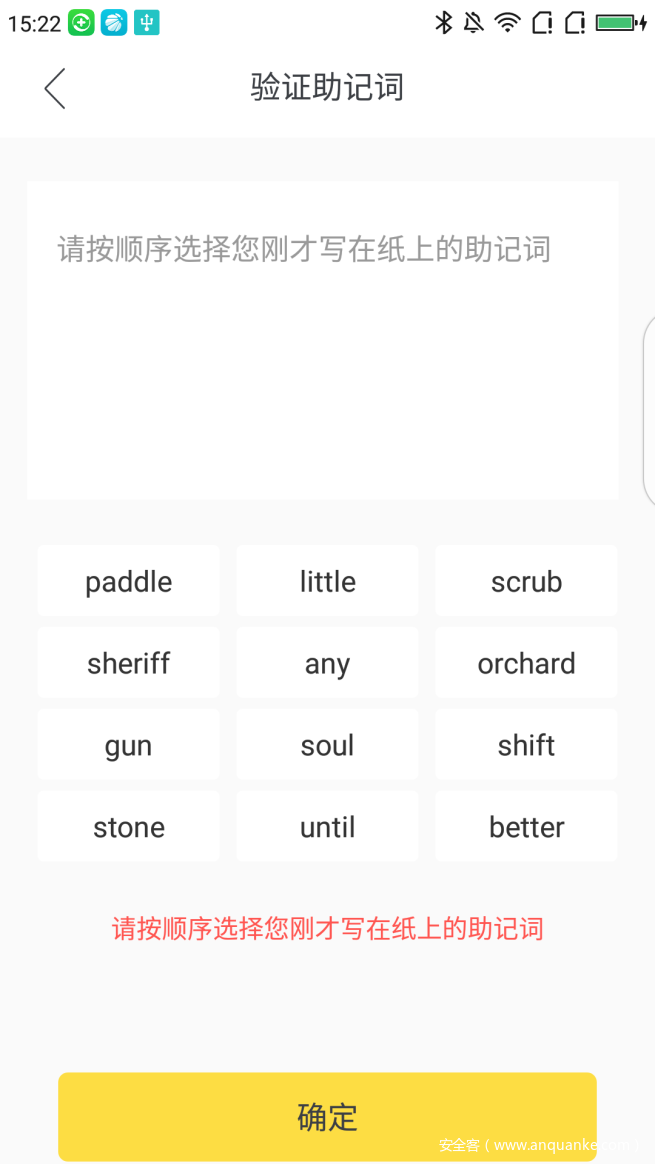 大多数数字货币钱包在第一次运行时都会提示用户是否创建新钱包。 当用户创建新的钱包时,数字货币钱包会通过一系列算法生成私钥。 正常情况下,私钥不会被显示。 而是以助记词的形式提示用户进行钱包备份操作。 以下是某数字货币钱包的助记词界面。 这个算法有一套行业标准,私钥可以通过助记词推导出来。 然后从私钥推导出其他数据。