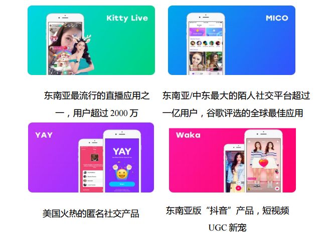 另一产品Kitty Live是东南亚领先的主流高端直播平台。 得到泰国“亿万女王”Mai代言,拥有超过2000万用户。 此外,社交矩阵还包括美国年轻人青睐的匿名社交应用YAY、“东南亚版抖音”、新宠短视频Waka等。