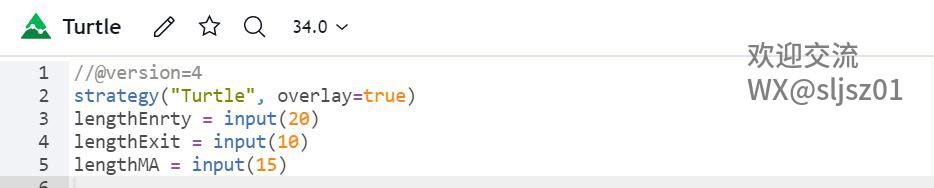 我们分三段来写这个策略,首先第一段我们在方法中声明这个策略,然后定义三个参数变量,分别是通道进入周期20,通道退出周期10,移动平均周期15,将它们定义为输入变量,这样我们就可以在Pine测试界面中直接修改参数值,而不需要改变原有的代码。
