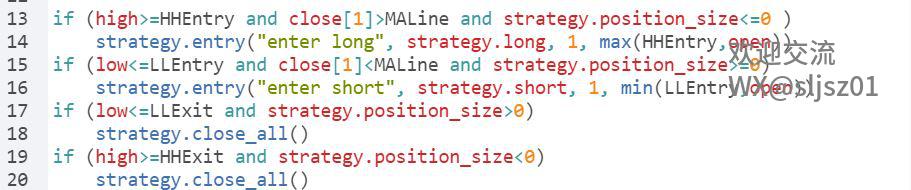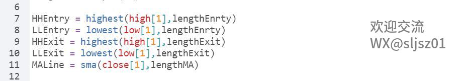 在策略的第二部分中,我们利用Pine内置的指标函数来定义唐奇安通道进出点的上下轨,以及收盘价的移动平均线。在代码中我们可以看到,对于每根K线,我们在最高价、最低价、收盘价的末尾都加上了[1]。这是为了计算并获取前一根K线周期的指标数据,防止在当前计算信号K线时使用未来的数据。