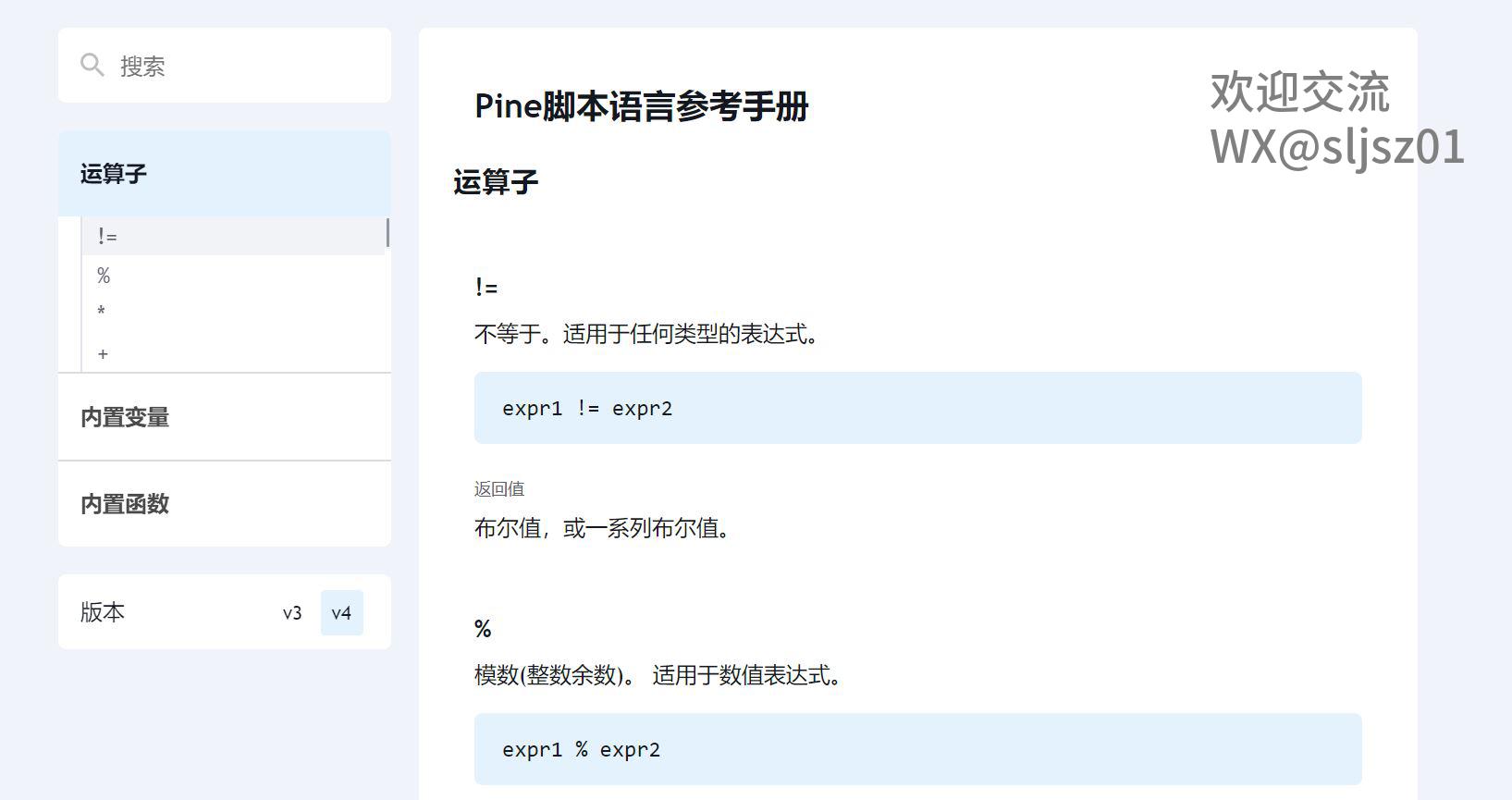 在编写我们的第一条策略之前,我们先来简单了解一下 Pine 语言的基本语法。可以说,Pine 语言比现在最流行的语言的语法要简单得多。技术极客们甚至认为,没有编程基础的同学在按照本文的指导后,也能编写出一些简单的策略。Pine 语言有语法参考手册,包含运算符、内置变量、内置函数三部分。运算符部分比较容易理解,大部分都和常用的数学公式或者常用的计算机语法类似。例如下图中 != 表示不等于,% 表示取余数。