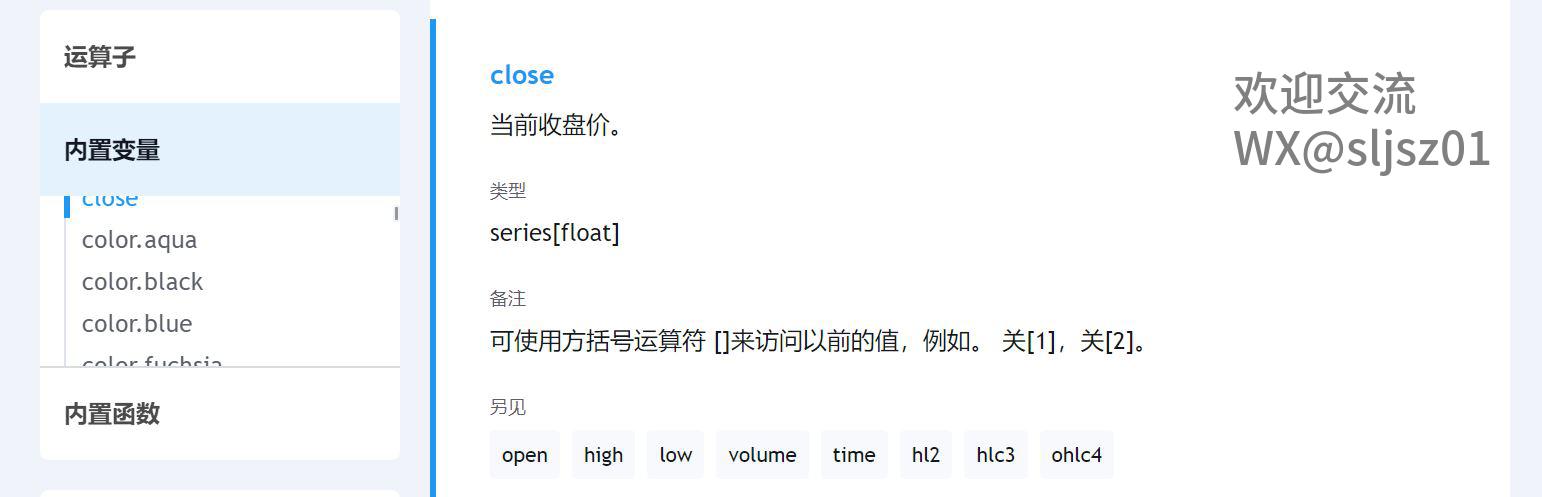 内置变量是指系统内置的一些关键字,通过这些关键字可以直接获取策略计算过程中所需要的关键数据,比如K线的开盘价、最高价、最低价、收盘价数据等。以下图为例,在代码中调用close可以直接获取每根K线的收盘价,open、high、low,同样分别是K线的开盘价、最高价、最低价、成交量。