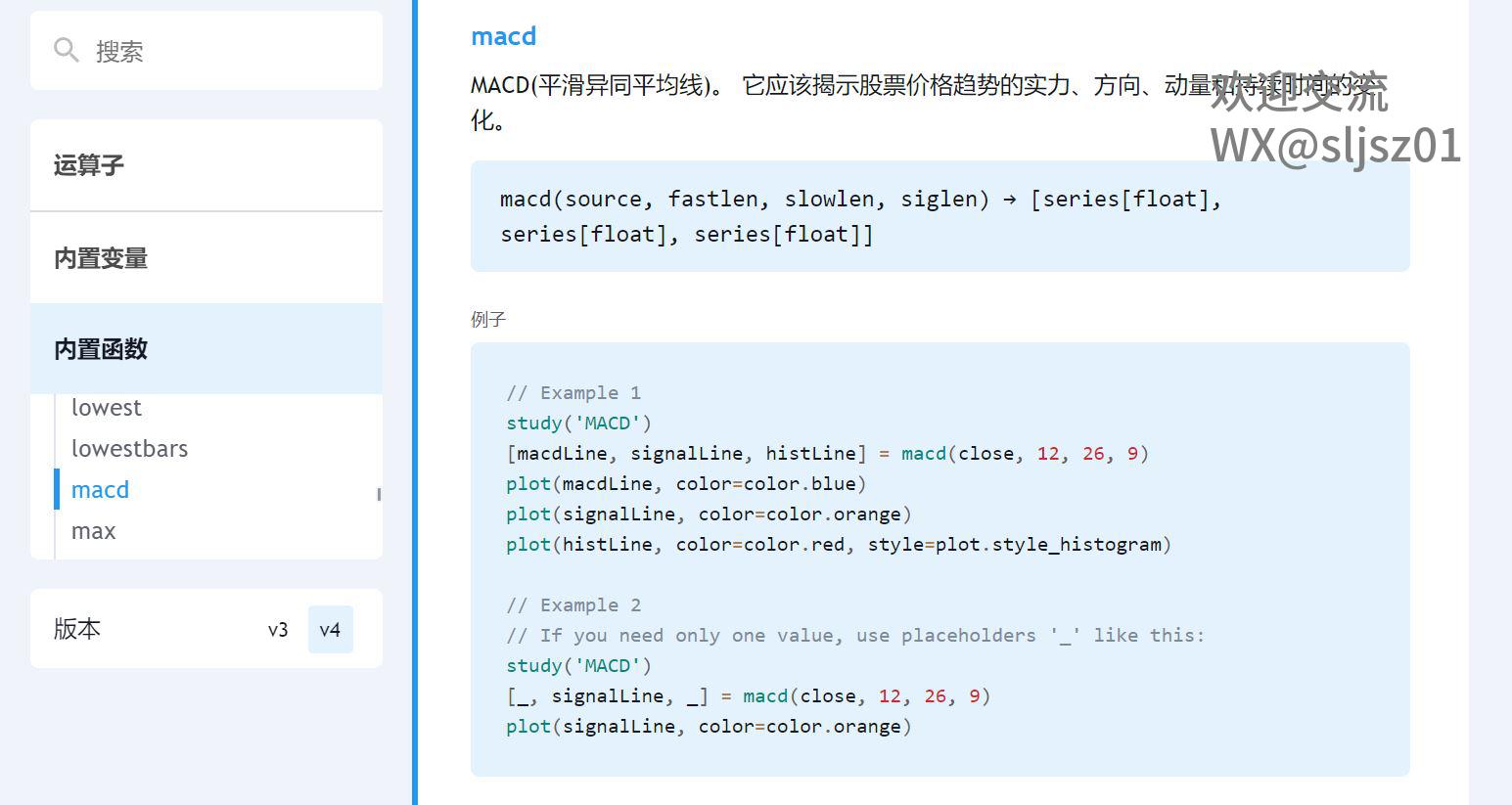 在内置函数中,最常见的就是技术指标,常见的技术指标,比如RSI、ADX、KD、MACD、ATR等,我们都可以找到对应的内置函数。如果我们想在策略中使用某个技术指标,只需要调用指标名称,而不用在指标里面写计算公式,就可以得到想要的结果。语法手册里也有详细的示例告诉你如何使用每个技术指标。