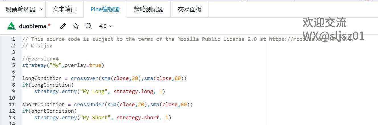 双均线策略是新手最容易上手的策略,交易规则很简单:当短期均线穿越长期均线时,平空头,做多头;当长期均线穿越短期均线时,平多头,做空头。我们就以这样一个简单的策略开启Pine语言的编程之旅,我们来看看如何实现: