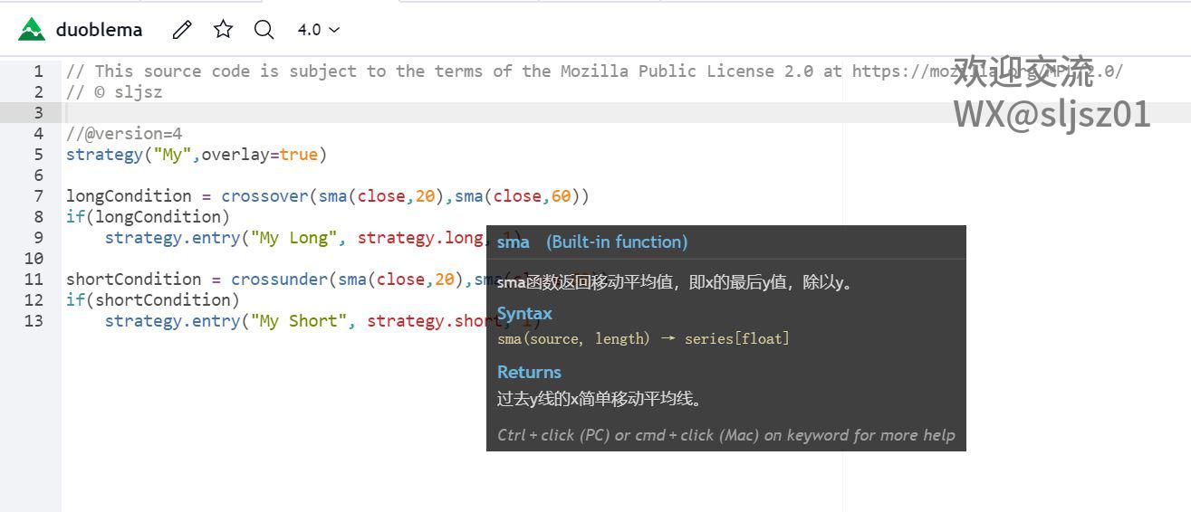 我们再看等号右边,(sma(close,20),sma(close,60))。我们已经知道这里的close是K线的收盘价okx,而sma和又代表什么意思呢?别着急,Pine编辑器有一个很好用的功能,只要把鼠标放到关键字上,我们就能知道系统对这个关键字的定义(内置变量,内置函数)。比如sma,系统提示我们它返回的是移动平均线。同理,和也可以用同样的方式解释(不得不说,真的好用)。