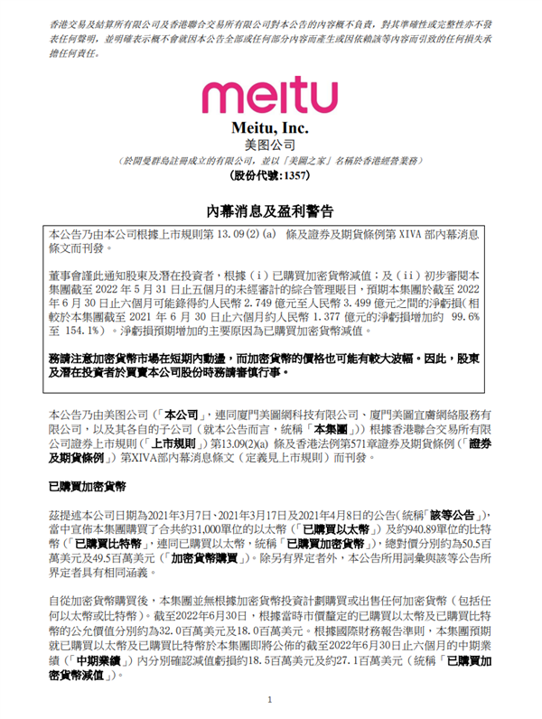 昨晚,美图公司发布公告称,预计今年上半年录得净亏损2.75亿元至3.5亿元欧易交易所,同比增长约99.6%至154.1%,主要因购入的加密货币减值所致。
