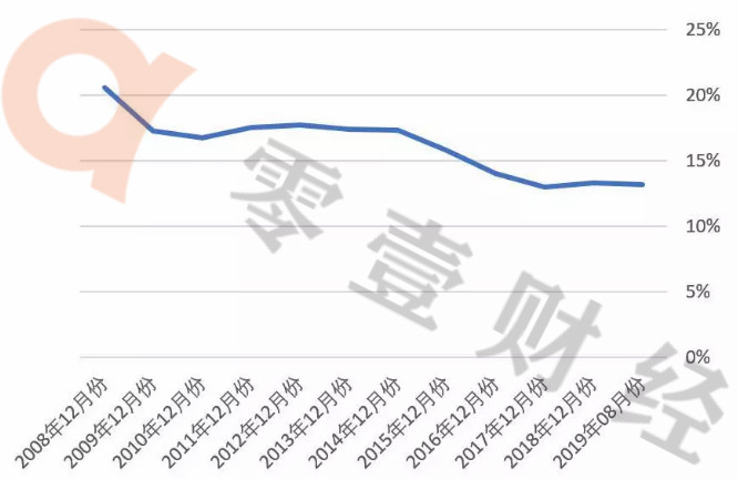 随着网络支付、移动支付的广泛普及,日常生活中现金的使用频率逐渐减少,狭义货币供应量M1代表人们当前的购买力,是作为交换媒介使用的货币总量。因此,考察M1中流通现金(M0)的占比,可以说明人们在交易结算中使用现金的程度。2008年至2019年,我国M1中流通现金(M0)的占比下降了7%。现金使用量的逐渐下降,一方面为我国发行法定数字货币奠定了社会基础,另一方面或许可以减少利用数字货币实施有效负利率政策的阻力。
