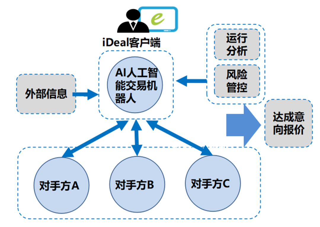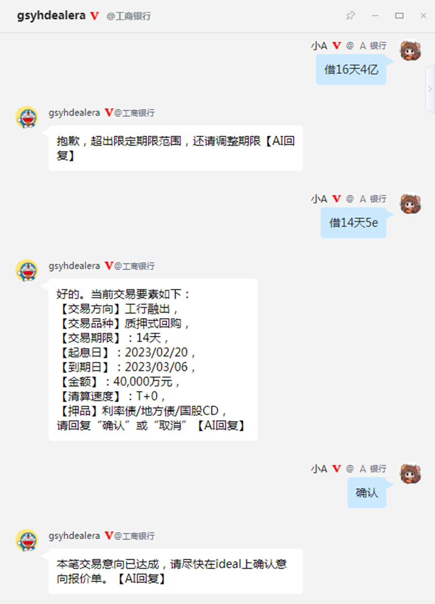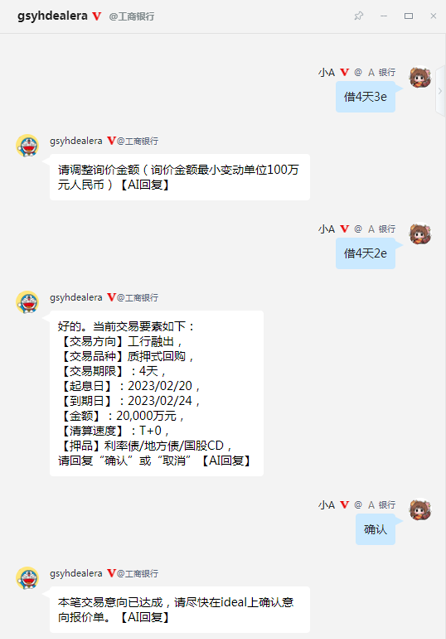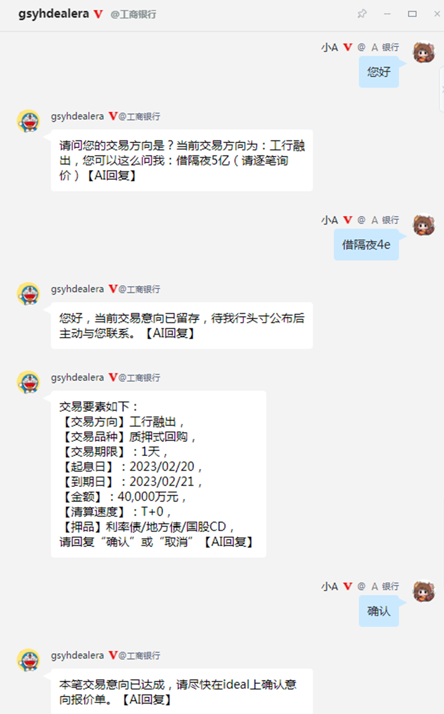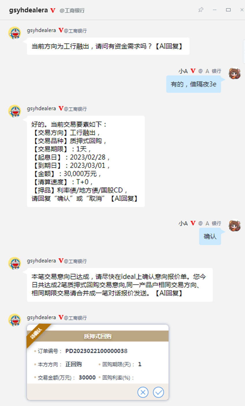 AI交易机器人可以早于交易员上班时间开始工作,记录一位名为“小A”的市场机构交易员的融资需求。融资方案确定后,若符合小A的需求,AI交易机器人会主动向小A推送意向报价,经小A确认后即可成功达成交易意向。