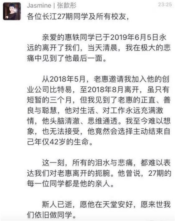 张欣彤在朋友圈发文缅怀老惠:“从2018年5月老惠邀请我加入他的创业公司,到2018年8月我离开,只有短短三个月,但我看到了老惠的真诚、善良和智慧,对生活和工作始终充满热情,头脑清晰,思考透彻。”