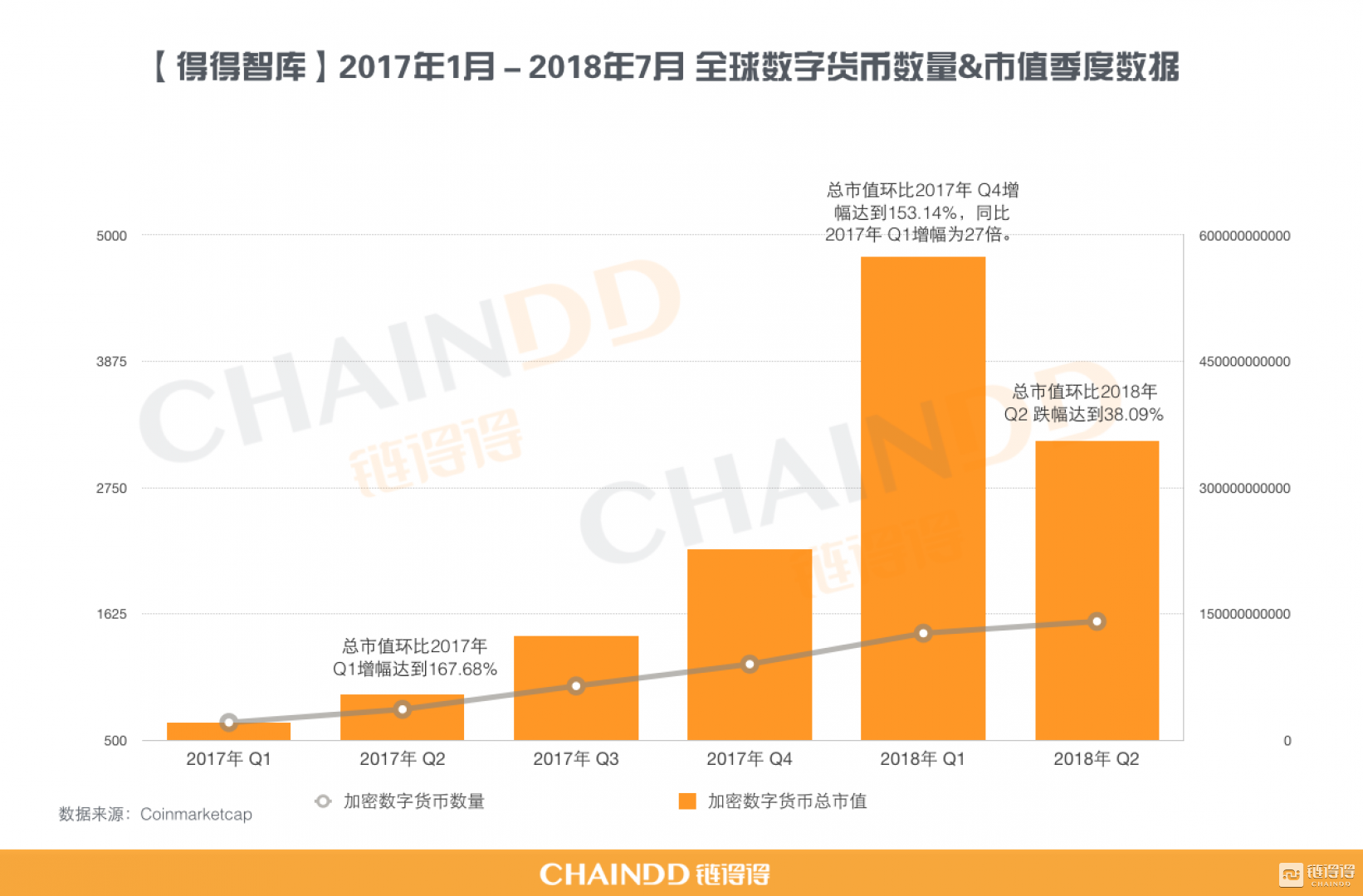2017年1月至2018年7月,全球加密数字货币总市值经历指数式暴涨暴跌,由177亿美元上涨至8238亿美元,随后回落至2561亿美元,2017年1月至今,季度平均市值环比增长率分别为:167.68%、128.17%、82.49%、153.14%、-38.09%。