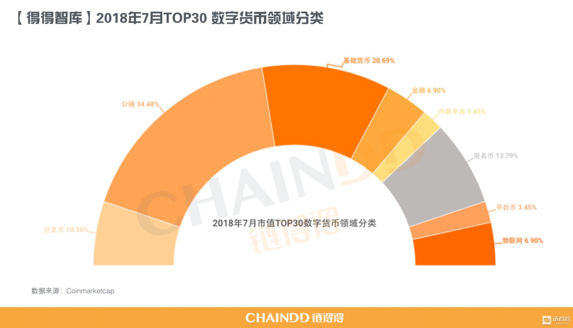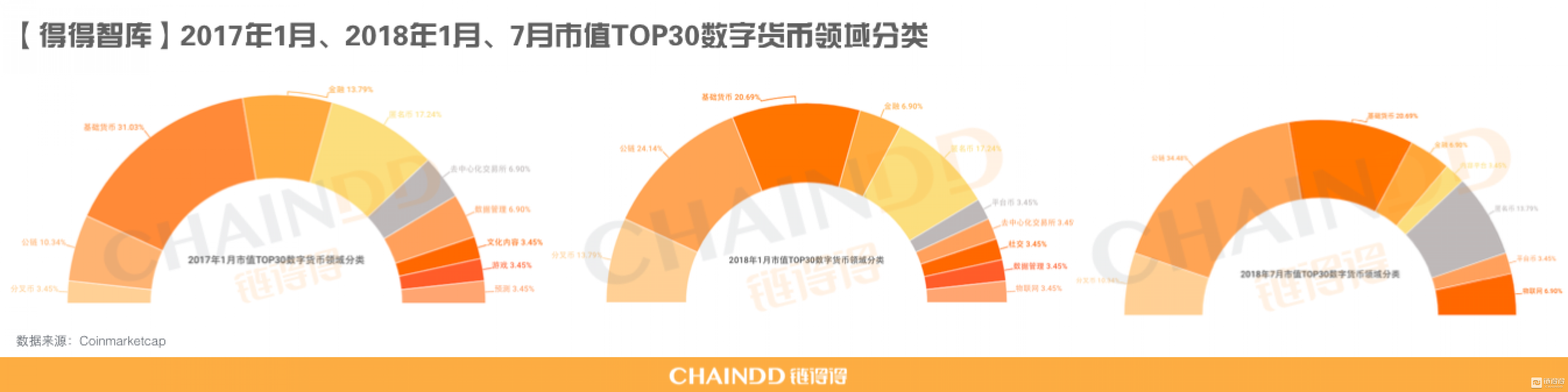 DeDe智库整理了2017年1月至2018年7月按市值排名前30的主流数字货币的应用领域,其中公链领域增幅最高,由10.34%增长至34.48%;分叉币领域由3.45%增长至13.49%。BTC、LTC等基础货币市值基数较大,基础货币领域变动幅度相对较小。
