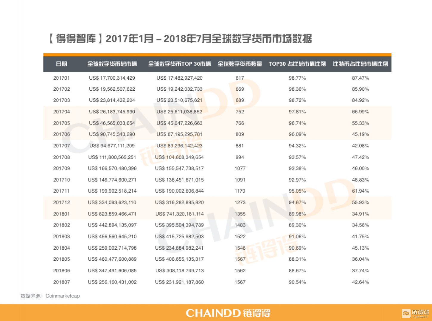 据德德智库统计,2017年1月至2018年7月,前30种主流数字货币的市值呈下降趋势,占全球数字货币总市值的比重在98.77%至88.31%之间波动,整体市值保持稳定领先地位。