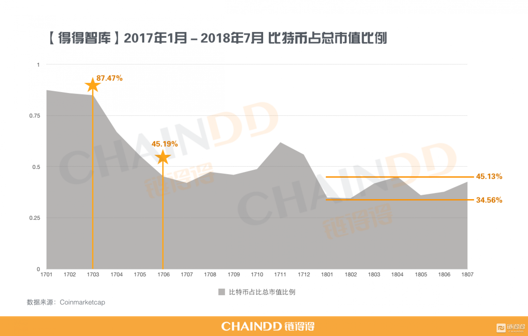 2018年至今,比特币的占比稳定在34.56%-45.13%之间,最高占比出现在2018年4月份,占总市值的45.13%。