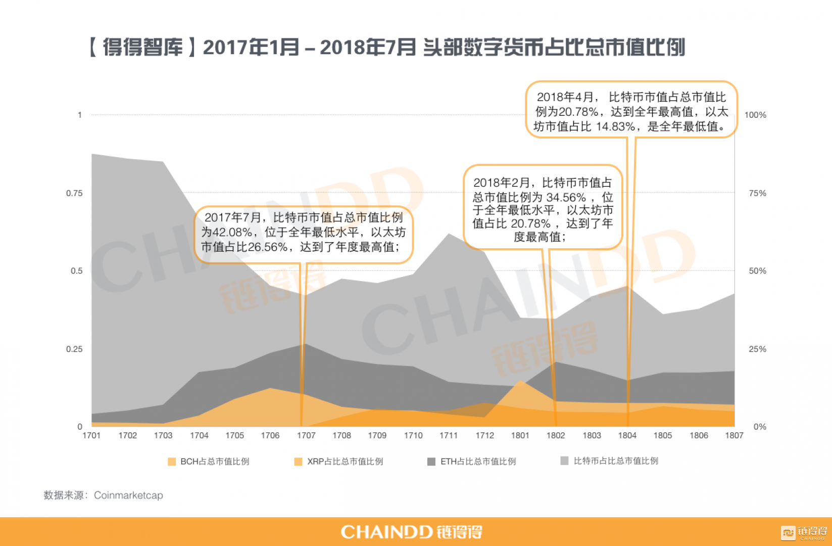 2017年7月,比特币的市值占总市值的42.08%,为年度最低水平,而以太坊的市值占比为26.56%,达到年度最高值。