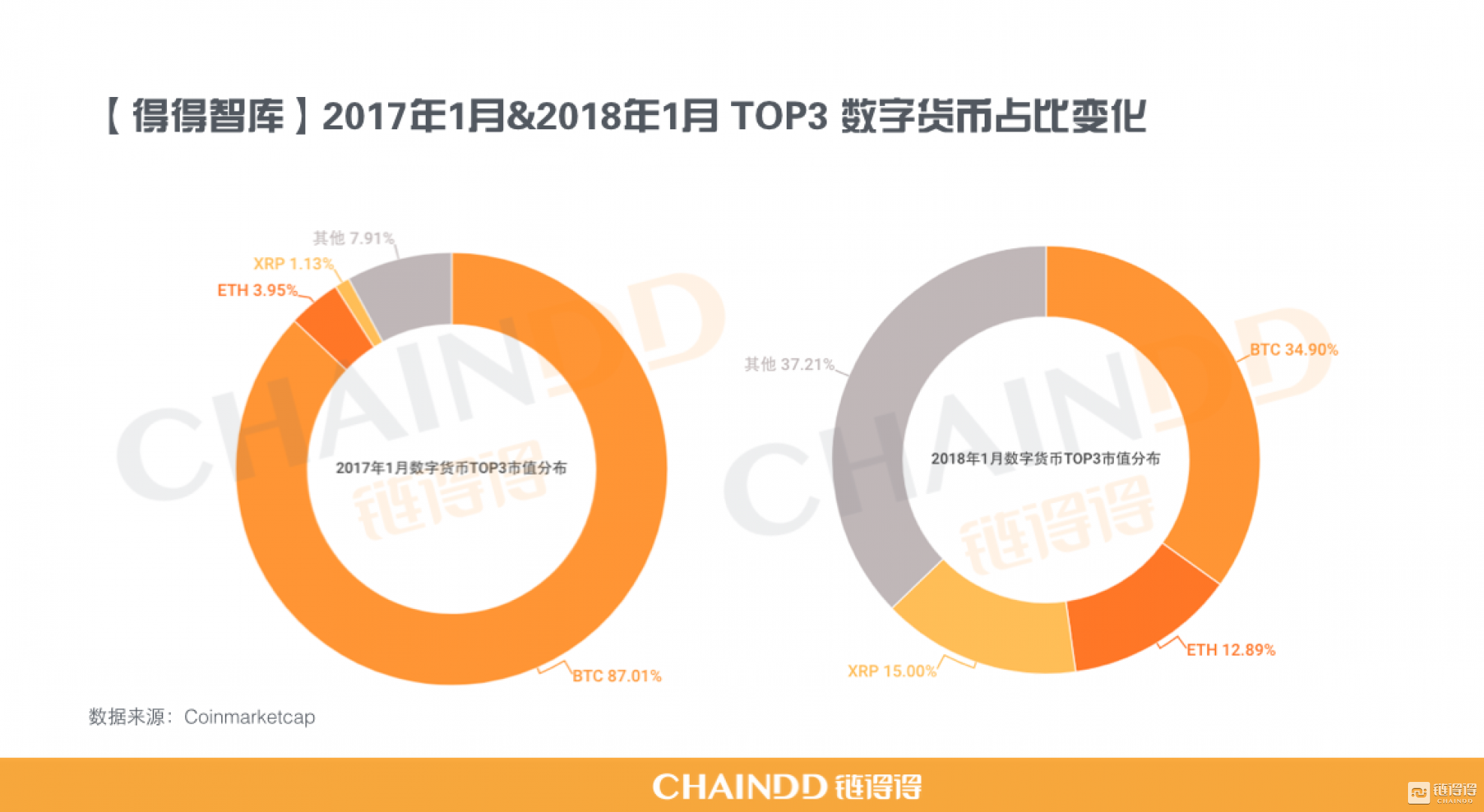 下图显示,2017年1月和2018年1月,比特币的市值大幅下降,而以太坊和瑞波币的市值则大幅上升。