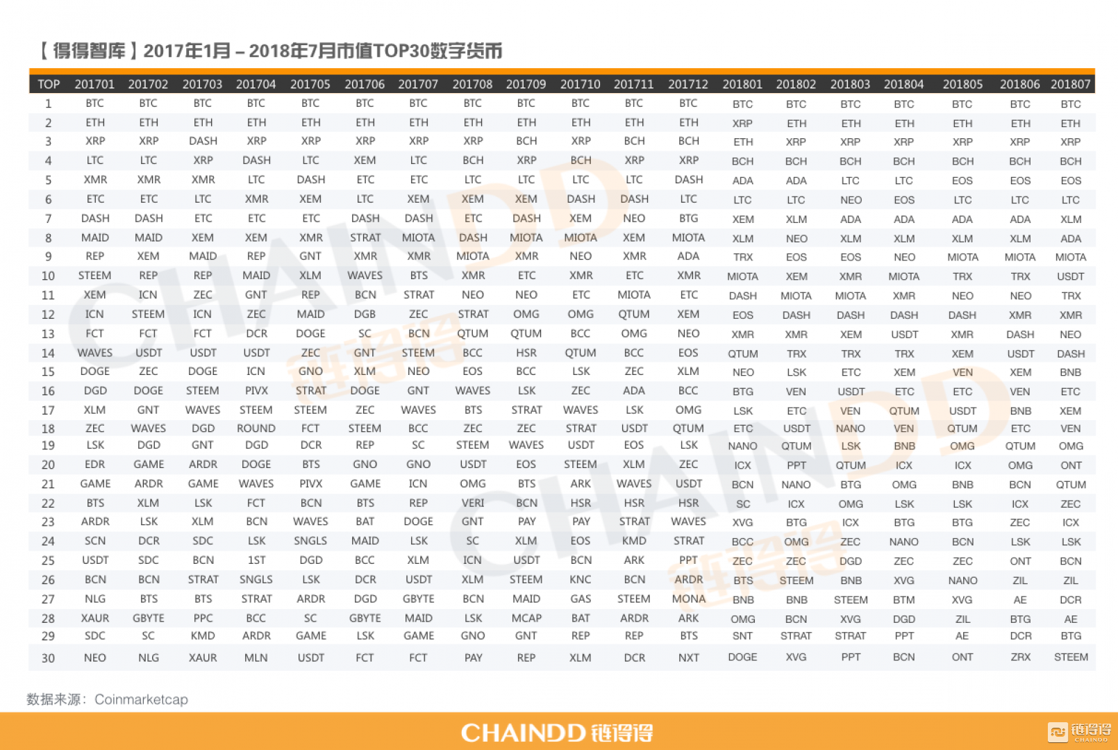 2、2017年1月至今,比特币主导地位有所下降,以太坊、瑞波币、比特币现金等头部数字货币纷纷涌现,市场逐渐去中心化,市值排名前30的数字货币依然占据主导地位。