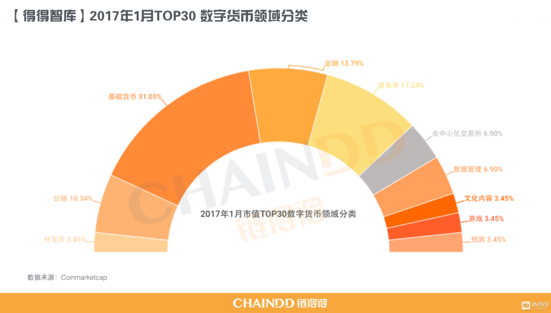 2017年1月,市值前30的数字货币主要集中在基础货币、匿名货币、金融领域,占比分别为31.03%、17.24%、13.79%。