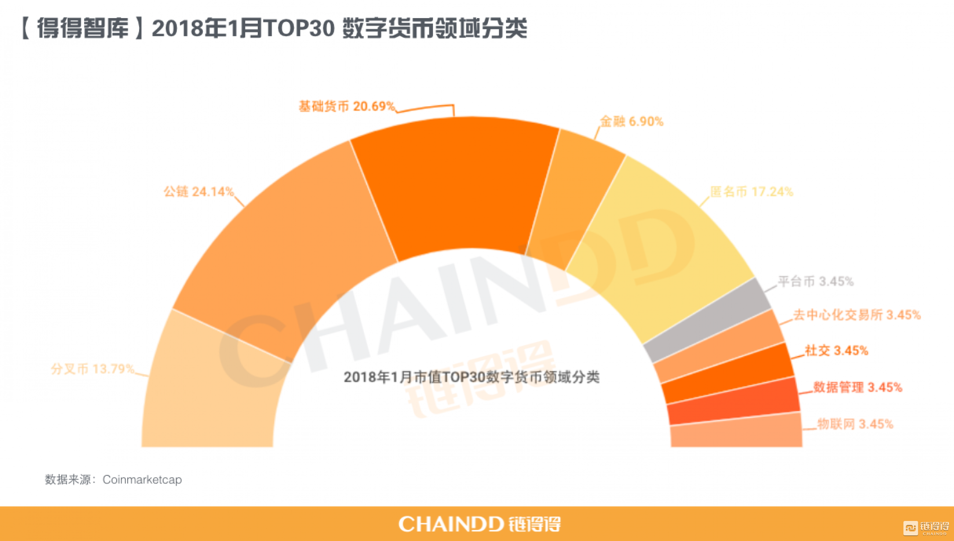 德德智库整理了2017年1月至2018年7月按市值排名前30的主流数字货币的应用领域,其中公链领域涨幅最高,由10.34%增长至34.48%;分叉币领域则由3.45%增长至13.49%。BTC、LTC等基础币种市值基数较大,基础币种领域涨幅相对较小。
