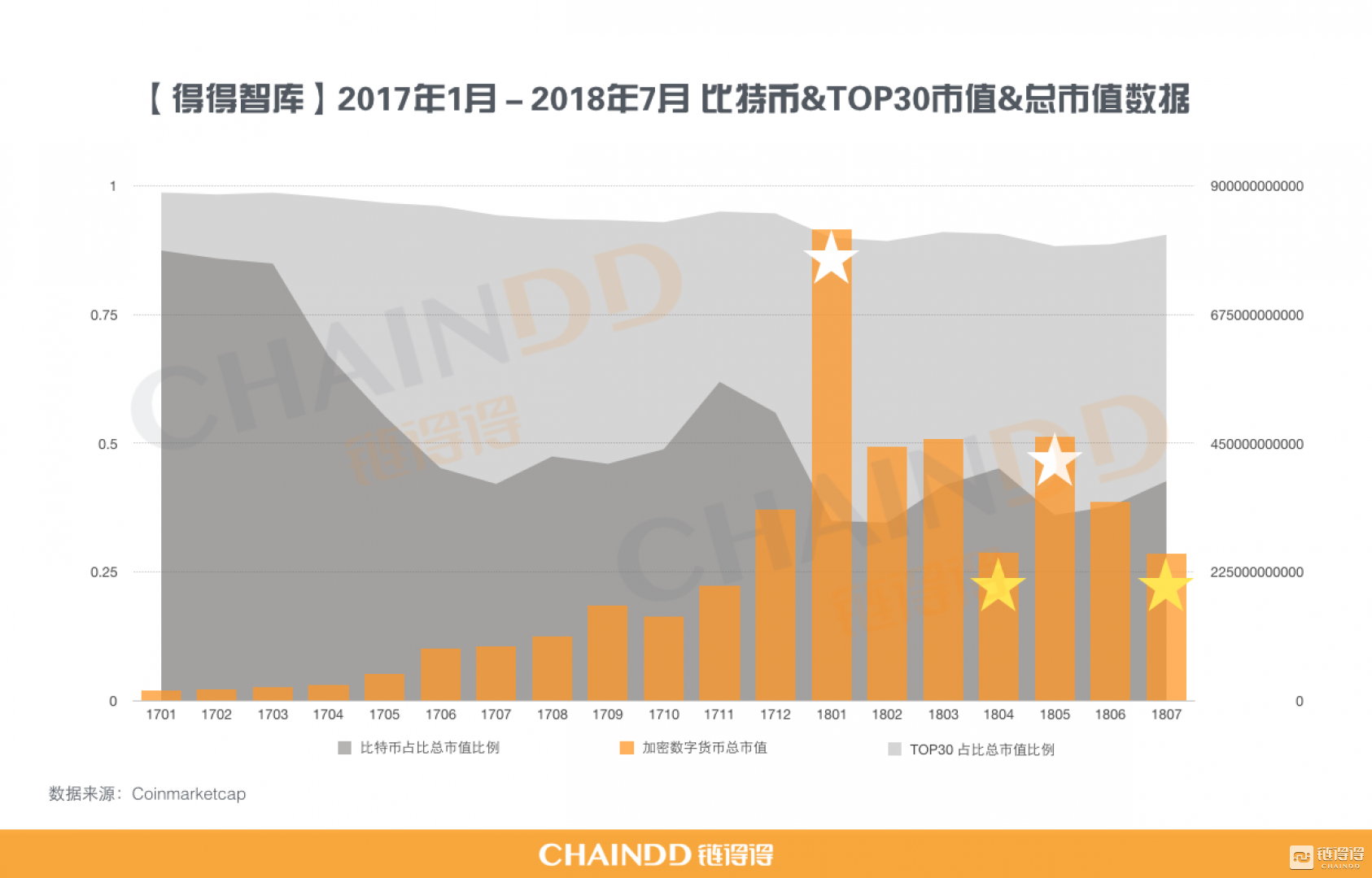 上图中标有白色星号的月份为2018年1月和5月,是数字货币总市值增幅最大的月份,在此期间,比特币的市值占比呈现下降趋势;标有黄色星号的月份为2018年4月和7月,是数字货币总市值降幅最大的月份,在此期间,比特币的市值占比呈现上升趋势。
