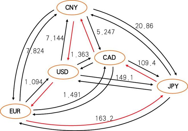 货币套利是指通过同一种货币在不同市场进行不同价格交易来获利的方式。如图1所示,图中汇率为2023年11月27日的实时汇率数据。例如100元人民币折算成美元,美元折算成欧元,欧元折算成人民币,折算后的人民币面值为:100×(1/7.144)×(1/1.094)×7.824≈100.11。经过一个周期的交易欧意交易所,人民币面值从100变成100.11,人民币面值升值0.11%,说明这一周期有套利空间,反之则无套利空间。