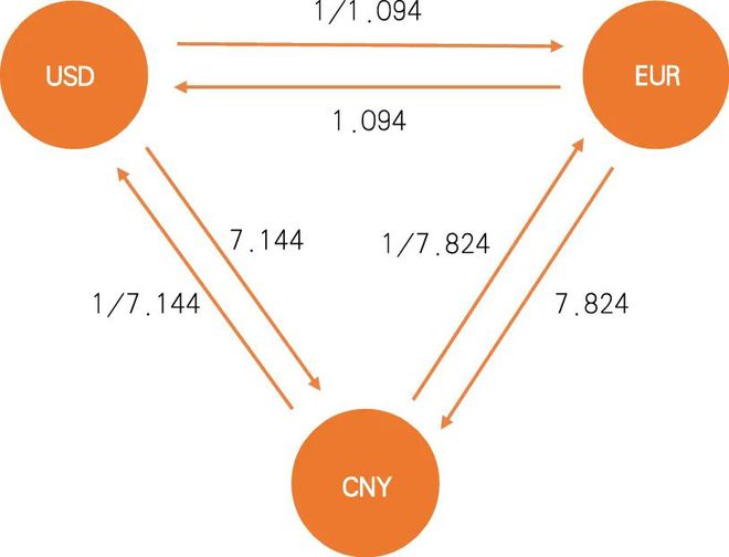 图1 美元(USD)、人民币(CNY)、欧元(EUR)货币兑换有向图