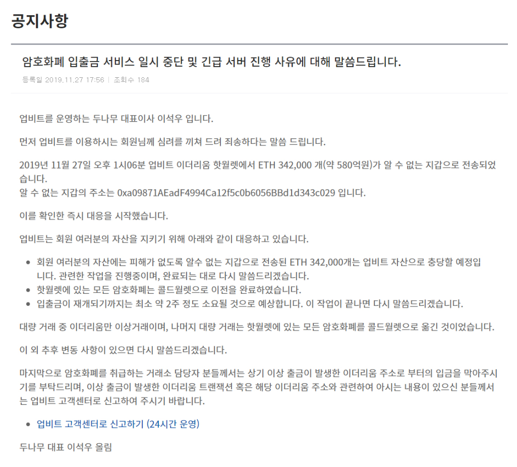 2019年11月27日18:00,韩国数字货币交易所UPbit就盗窃事件发表声明。 声明称,27日13时6分,UPbit管理的数字货币ETH被转入虚拟账户“29”,造成直接损失3亿多元。 当日14点16分,UPbit发现数字货币被盗,立即关闭数字货币交易通道,并声明“系统需要维护”。