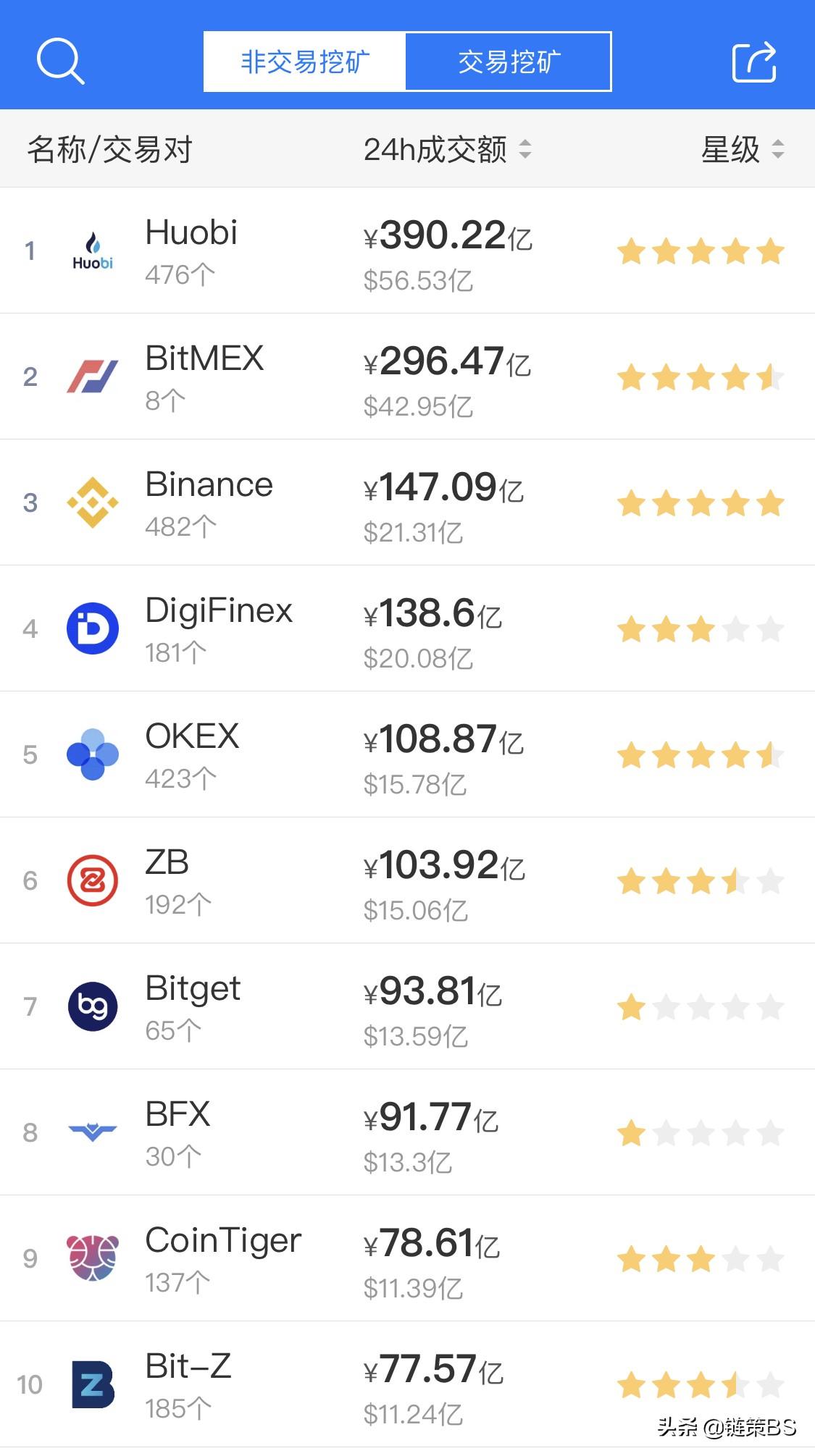据非小号2019年6月19日实时统计,交易量排名前十的数字货币交易所如下: