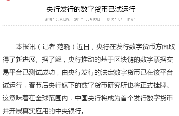 报道认为,这意味着中国人民银行将成为全球首个发行数字货币并开展现实应用的央行。